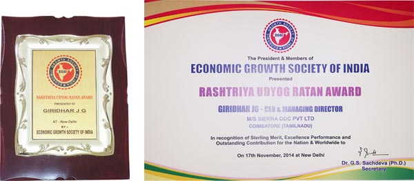 SIERRA, bestowed with "RASHTRIYA UDYOG RATAN AWARD" by the 'Economic Growth Society of India' (EGSI)